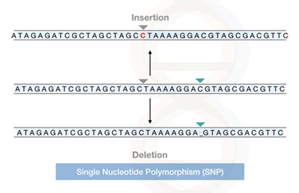 জিন সিকোয়েন্সিং করে কী ধরনের জিনিস বোঝা যায়, নীচের ছবিতে তার একটা উদাহরণ দেওয়া হলো। এটাকে বলে SNP বা সিঙ্গেল নিউক্লিওটাইড পলিমরফিজম (single-nucleotide polymorphism)। এখানে কোনো একটা রেফারেন্স বিন্যাসের সাথে ঠিক একটা অক্ষরের তফাত রয়েছে।