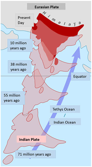 প্রায় 5 কোটি বছর আগে, ভারতীয় পাত একটি অসাধারণ যাত্রা শুরু করেছিল। প্রতি বছরে প্রায় 15 সেন্টিমিটার বেগে উত্তর দিকে এগিয়ে যাচ্ছিল (টেকটনিক পাত সাধারণত এত তাড়াতাড়ি ধাবমান হয় না)। ভারতীয় পাতের উত্তরমুখী আগ্রাসনে, টেথিস মহাসাগর সঙ্কুচিত হতে শুরু করেছিল।